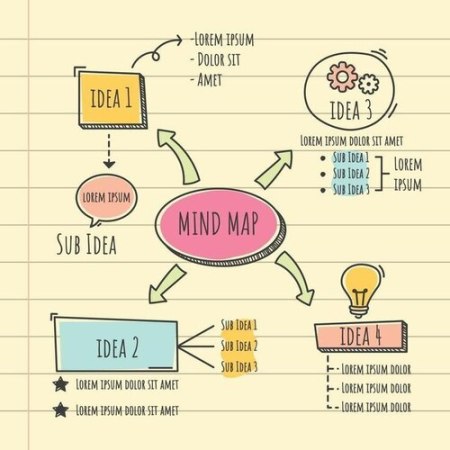 Ментальна карта, інтелект-карта чи карта пам’яті — мабуть, найпоширеніша у світі техніка конспектування. У центрі листа розмістіть тему, від неї спрямуйте стрілки, що вказують на підтеми, основні поняття, їх короткий опис чи ілюстрації. Ваш запис має відображати суть і взаємозв'язки.