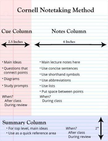 Улюблений метод американських студентів. Ви маєте розділити аркуш на три частини. У вертикальному вузькому стовпці зліва записуйте основні питання та визначення, у широку справа — свої нотатки, а у невеликій нижній горизонтальній частині підбийте підсумки, які можна зробити після лекції.