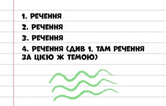 Кожну тезу або речення пишіть з нового рядка, при цьому нумеруючи. Такий конспект дуже зручно повторювати та завчати.