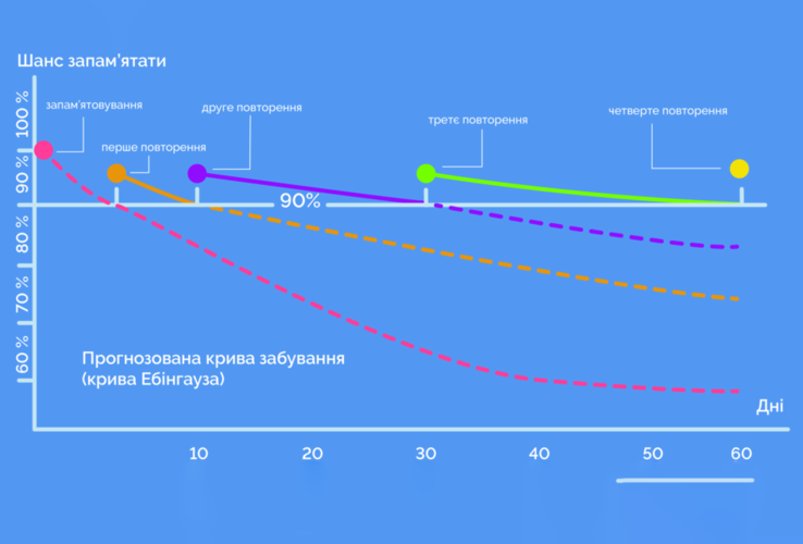 Як ви вже знаєте, нашу пам'ять формують нейронні зв'язки. Кожен з них відповідає за певну інформацію. Щоразу, коли ми пригадуємо її, зв'язок посилюється. Приміром, щоб якісно запам'ятати певний навчальний матеріал, дослідники рекомендують повторити його через 10-20% часу між вивченням і моментом застосування. Тобто, якщо ви зараз готуєтесь до екзамену, який відбудеться за два тижні, то бажано продивитись потрібну інформацію приблизно через три дні. Наочно це можна побачити на кривій Еббінгауза.