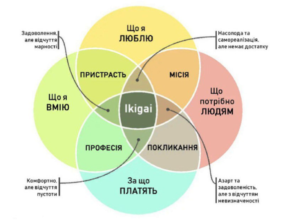 Отже, зверніть увагу на ділянки діаграми, які знаходяться на перехресті питань — професія та пристрасть, пристрасть й місія, місія та покликання, покликання й професія. А у центрі всієї діаграми знаходиться таємничий ікігай.