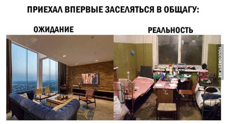 -Общежитие. Насмотревшись сериалов, многие люди почему-то уверены, что жизнь в общаге гарантирует регулярное веселье. Увы, в жизни все не так красочно. Условия в общежитиях для людей, привыкших к домашнему комфорту, будут настоящим испытанием. Общая кухня, душ и туалет едва ли кого-то обрадуют. А если еще и с соседями по комнате не повезло…