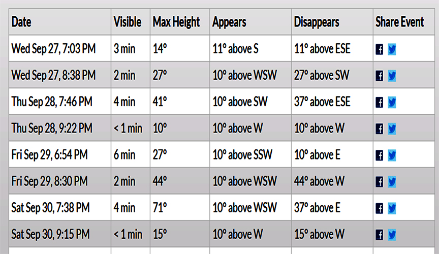 Бесспорно, самым авторитетным источником в данном вопросе является NASA. В разделе “Spot the station” (https://spotthestation.nasa.gov/) следует найти свой город. Сервис выдаст таблицу с данными о появлении МКС в районе выбранной геолокации, имеющую такой вид: