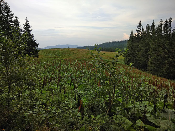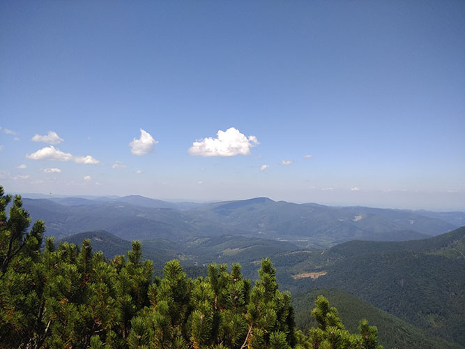 И вот они Карпаты. Нашу группу окружил чудесный хвойный лес. Казалось, что откуда-то вылезут гномы, и мы пойдем рубить драконов. Вдоль тропы росла черника. Даже вот так ЧЕРНИКА. В итоге, все шли с черно-фиолетовыми губами и не менее устрашающими руками.