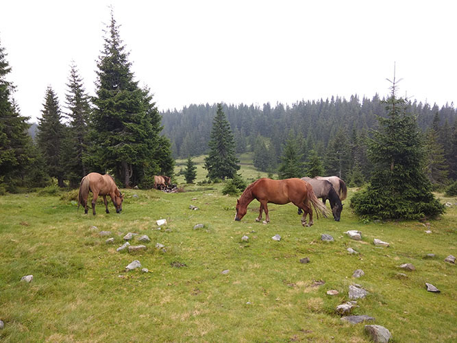 Спуск занял какое-то время. Мы успели натереть мозоли, пока дошли до поляны. Но оно того стоило. Мягкая травка, солнышко - красота. Собака, которая следовала за нами третьи сутки, отгоняла стадо пасущихся лошадок от лагеря. Но, не смотря на нее, эти “газонокосилки” чуть не стащили наш завтрак.