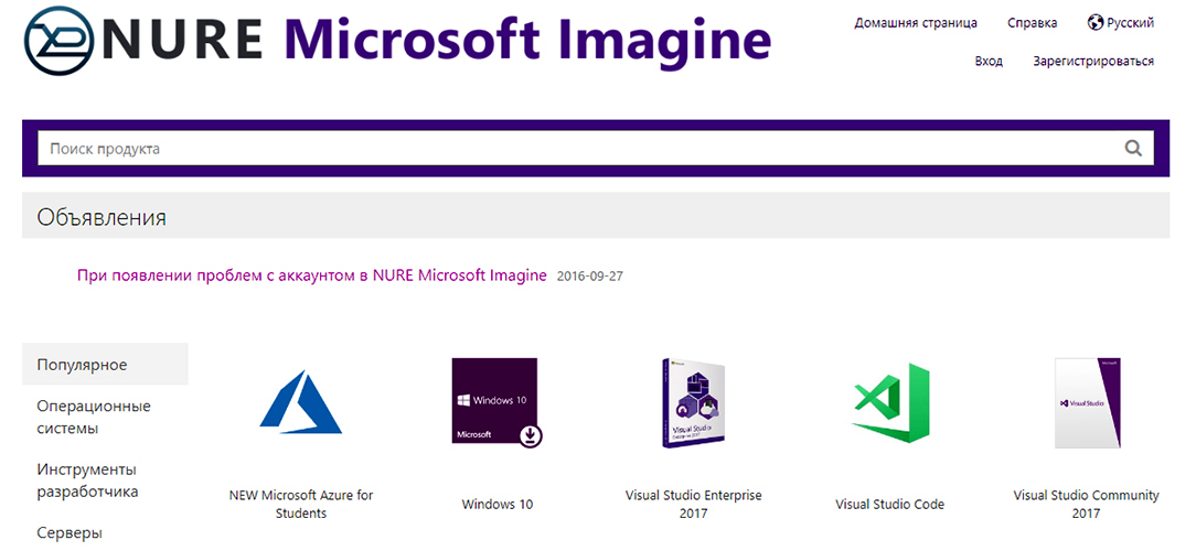 На странице со списком доступных программных продуктов есть удобное деление на категории, поиск по названию. Отдельно стоит отметить, что можно столкнуться с широким выбором версий той или иной программы. Не стоит бездумно кликать по первому элементу списка, лучше посоветоваться с преподавателем (особенно касается Visual Studio) или погуглить.
