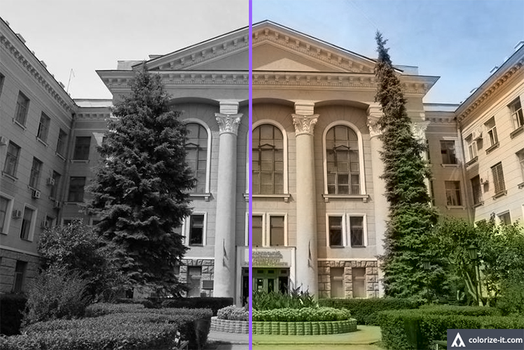 Ричард Жэнг – автор нейронной сети, которая обучалась распознавать различные предметы, классифицировать их и в зависимости от этого окрашивать в нужный цвет. 100% совпадения добиться сложно, вот что получилось у нас с фотографией ХНУРЭ:
