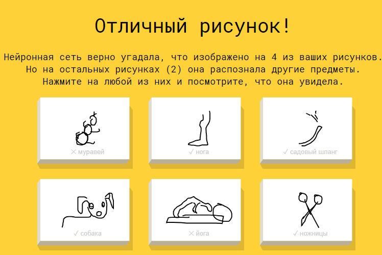 На сайте https://quickdraw.withgoogle.com/ есть возможность поиграть с нейронной сетью: вам предлагается последовательно нарисовать 6 объектов (это может быть что угодно: животные, спортивный инвентарь, хозяйственные предметы и не только). Пока вы рисуете (время ограничено), догадки системы озвучиваются женским голосом из «Переводчика».