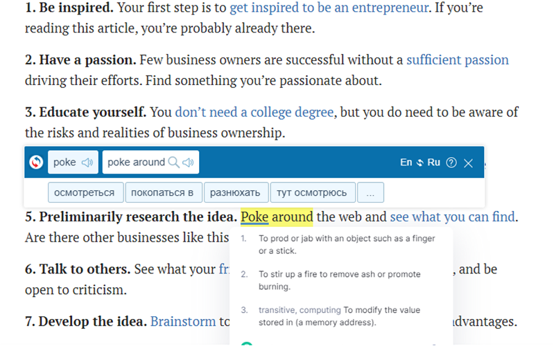 Дозволяє перекладати окремі слова або короткі речення з російської на англійську. Хтось поставить його на один щабель із вбудованою функцією Chrome перекладач. Але ці два інструменти мають дві головні відмінності. По-перше, Reversо корисний у тих випадках, коли перекласти потрібно окреме слово, з метою дізнатися значення/варіанти значення (тобто за допомогою мовних особливостей, прослуховування правильної вимови). По-друге, Reversо працює там, куди перекладач не дотягується: і в онлайн-pdf документах, і навіть на англійських субтитрах YouTube.