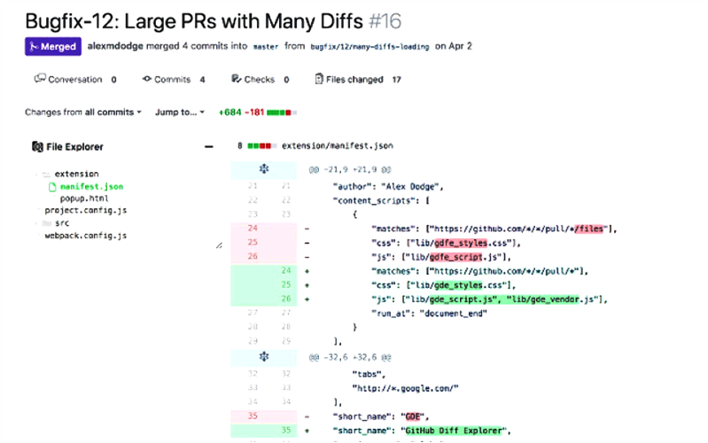 Гілки можна створювати паралельно, поєднувати по черзі й наочно дивитися на відмінності в коді — прямо у файлі «нові» рядки коду щодо головної версії «ствола» будуть виділені іншим кольором.