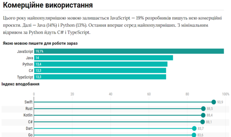 Якщо ми поглянемо на аналітику мов програмування від Dou на 2023 рік, то побачимо, що мова C# займає четверте місце у рейтингу і лише трохи поступилася своїм конкурентам Python та Java. А по індексу вподобання (показник, що показує частку людей, які пишуть цією мовою і для наступного проєкту обрали б її також) обійшла їх, набравши 88.1%, що є одним з найкращих результатів.