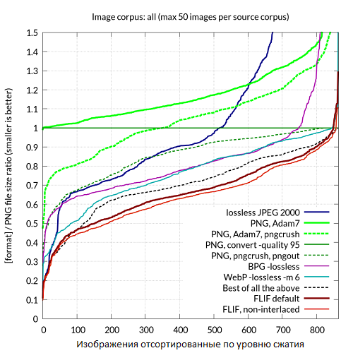 На графике ниже предоставлены результаты тестирования, аналогичного тестированию WebP. Вы можете видеть, что FLIF однозначно побеждает все другие инструменты,