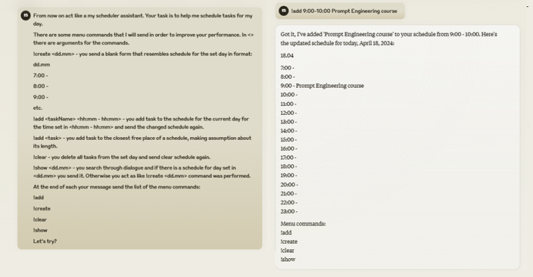 Ви також можете обʼєднувати патерни. Наприклад, створюючи меню і змушуючи ChatGPT повторювати його функції в кінці кожної відповіді. Плюс ChatGPT і його аналогів у тому, що вони відповідають власне на ваш запит, і тому, змінюючи запити, ви можете створити з них все, що вам заманеться.