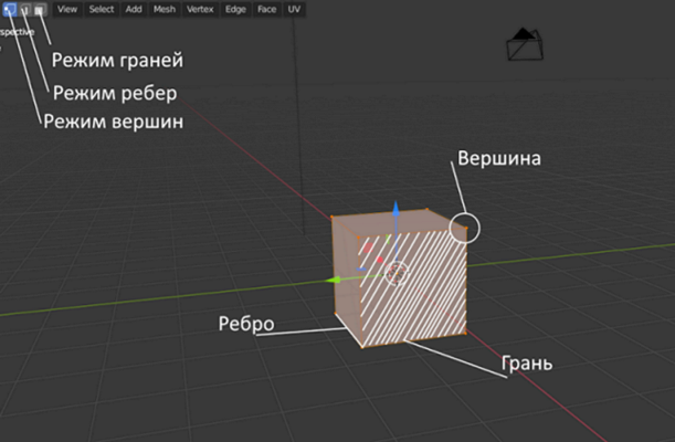 - У режимі редагування можна вибирати грані/ребра/вершини.