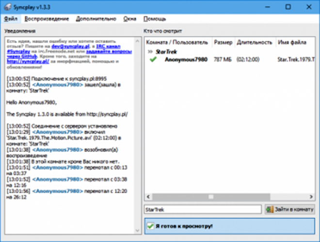 Для группового дистанционного просмотра пригодится утилита Syncplay, которая нужна для синхронизации видеоплееров. С ней воспроизведение выбранного фильма будет идти одновременно на подключенных компьютерах, где бы те не находились. Приложение синхронизирует не только воспроизведения, но и перемотки и паузы. В текущей версии Syncplay поддерживает работу с VLC Player, Media Player Classic, mpv и mplayer2.
