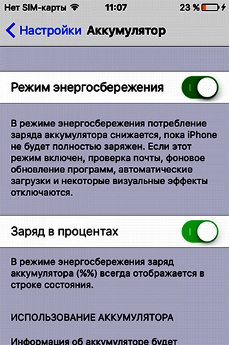 Режим энергосбережения. Судя по всему, прошли времена, когда Apple была уверена в лучшей автономности по сравнению с конкурентами. Да и пользователи познакомились с быстрым разрядом их устройств. Правило 10 часов без разряда оказалось черезвычайно сложным. Пункт «Режим энергосбережения» из раздела о батарее Android, перекочевал в iOS9. В этом режиме, понизится производительность процессора, приложения не будут работать в фоне, отключаться анимации.