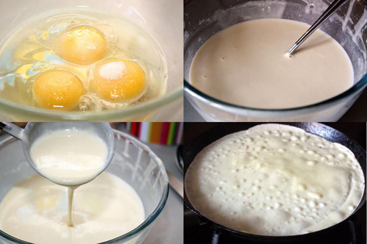 Смешиваем 2 яйца, половину чайной ложки соли и 1 чайную ложку сахара. Наливаем 350 миллилитров молока и медленно размешиваем. Не прекращая мешать, всыпаем муку, вымешиваем до однородной консистенции, добавляем оставшееся молоко. Тесто готово. Жарим блины на раскаленной сковороде, предварительно смазанной маслом или салом.