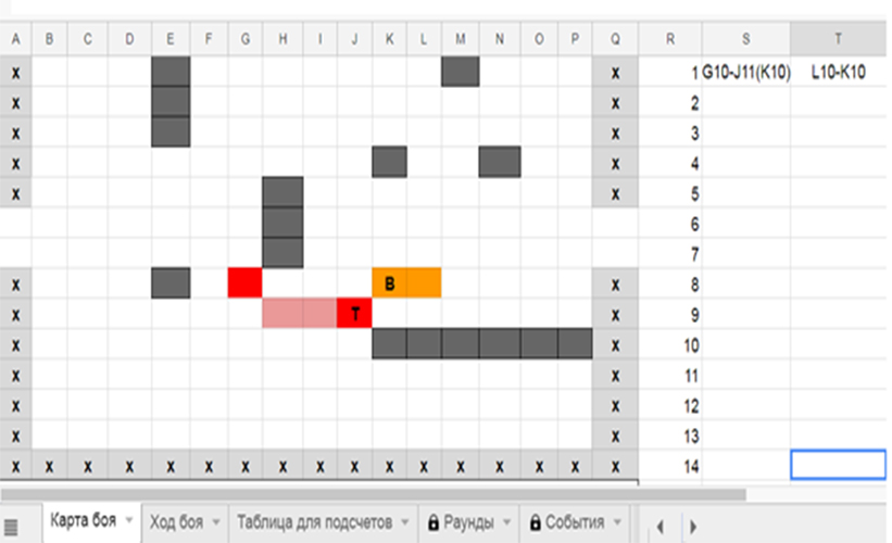 Сам бой, расположение персонажей, преград и укрытий участники битвы и судья видят на небольшом поле, основанном на сетке excel. Таким образом, все становиться более наглядно и быстрее, исключая шанс на ошибки в расчетах.
