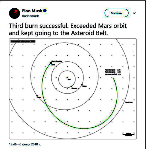 Но не все так гладко: вторая ступень Falcon Heavy слишком сильно разогнала «Теслу» — и вместо того, чтобы курсировать вокруг Солнца между Землей и Марсом, она отправилась лавировать в пояс астероидов между Марсом и Юпитером