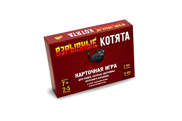Вот как в нее играть: вы тянете карты, пока кто-то из вас не вытянет карту «взрывного котенка» и не вылетит из игры. Конечно, если у вас нет карты, которая может обезвредить взрыв! В «войне» все правила хороши: лазерная указка, кошачья терапия или мятные бутерброды.… Есть карты действия, которые используются для предотвращения, смягчения или же перемещения взрывного котенка. Например, вы можете использовать свое любимое «леопардовое белье» или же нападать на друзей «волосами на спине». А можно просто воспользоваться магическим даром «Свин-о-Рога» или мудростью «Всезнающего Козла Волшебника», чтобы подглядывать в колоду. Не забудьте подружиться с Такокотом, Краболинкольном и грозным Дракокотом . Чтобы выиграть в этой высоко стратегической котенковой версии Русской рулетки, вам нужно решить какие карты сдавать, когда сыграть и кого из соперников выбрать целью. Игра точно подымит вам настроение или же взорвет!