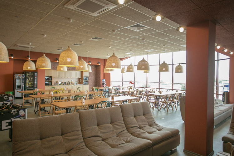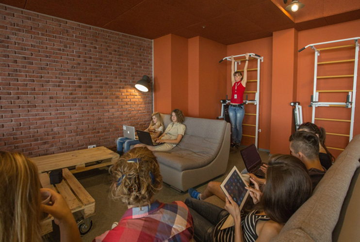 Сам офис – это 10-этажное здание. У нас есть 3 комнаты отдыха, в которых ребята часто устраивают лекции или конференции так же в них проходят разнообразные соревнования, игры, мастер-классы. Одна из самых интересных — “футбольная” на 4 этаже, посвященная нашим многократным чемпионам IT-Лиги.