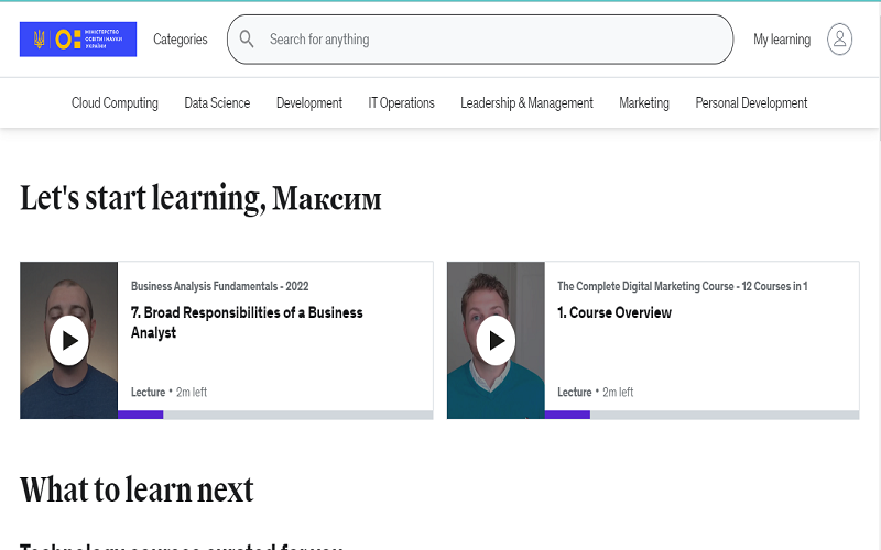 Одна з найпопулярніших платформ для навчання, має попит серед айтівців. На ній ви знайдете як курси з дисциплін, що вас цікавлять, наприклад, бізнес аналіз, веброзробка, так і щось для особистого розвитку: лідерські навички, тайм-менеджмент, емоційний інтелект. На відміну від попередніх двох платформ, ці курси створюють приватні компанії або й окремі викладачі. Тепер не треба «піратити» ці курси на сумнівних сайтах, достатньо просто зареєструватися! Спочатку треба заповнити форму для реєстрації. Детальніше про це тут
