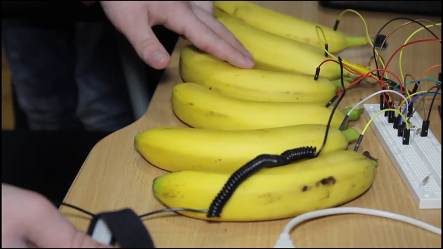 С помощью шести бананов, подключённых к плате ардуино, можно было извлекать звуки. Технология разработки стара как мир и очень проста – прикасаясь к банану, вы изменяете его вольт-амперную характеристику, это замечает микроконтроллер в плате и издаёт звук соответствующий номеру банана, к которому прикоснулись.