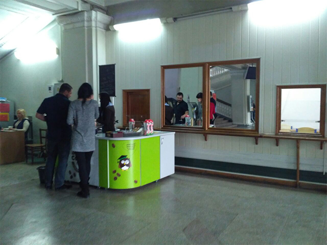 Слева находится буфет, идентичный буфету на 2 этаже, а вот чуть дальше находится самое популярное среди студентов место – кафе, в котором после приготовления кофе вы сможете добавить в него столько сиропов, сколько захочется. Можете добавить сахарозаменитель, какао, корицу, выбрать трубочку любимого цвета. Цены на популярные латте и капучино – 16/20 грн (маленький и большой размеры стаканчика).
