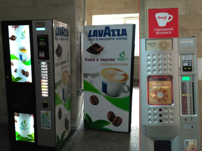 А теперь спустимся вниз по главной лестнице и завернем направо, где увидим необычный автомат, в котором приготовление кофе – это целое представление. Есть возможность выбрать размер стаканчика, ассортимент довольно широкий.